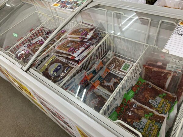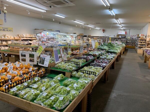 当店は地元の旬の野菜や果物を中心に販売しています。天然発酵肥料「土乃守」も好評です。入口すぐ左のショーケース内に肉のスズキヤさんのジンギスカンを置いてあります。鹿と猪のジビエがご家庭の食卓に並ぶと好評です。