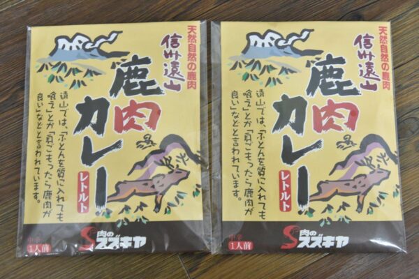飯田市の有名店・肉のスズキヤさんの鹿肉カレーです。温めるだけ! 天然の旨みたっぷりで、野菜は溶けるまで煮込み、肉は多めに入っています。ほかに、羊肉ジンギスカンの鹿、猪バージョンの鹿ジン・猪ジンも取り扱っております。
