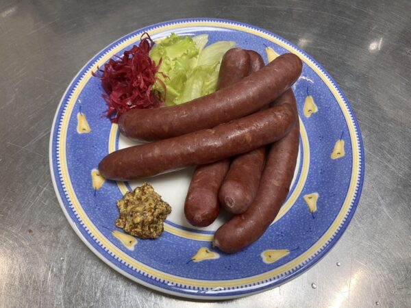 シカとイノシシのソーセージ:猟師の息子が獲ったシカとイノシシと豚の背脂で作ったジビエソーセージ。予約不要で提供されています。