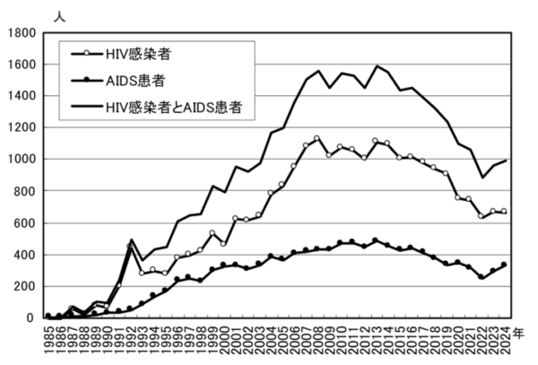 日本のHIV感染者とAIDS患者の年間の新規報告数の推移は以下のとおりです。