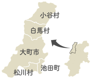 県の北西部、北アルプスの雄大な景色と清冽な水に恵まれた地域です。北部は長野冬季オリンピックの舞台となった白馬八方尾根など多くのスキー場や温泉がある山岳リゾート地で、南部は北アルプスの山々を背景にのどかで美しい安曇野の田園風景が広がっています。