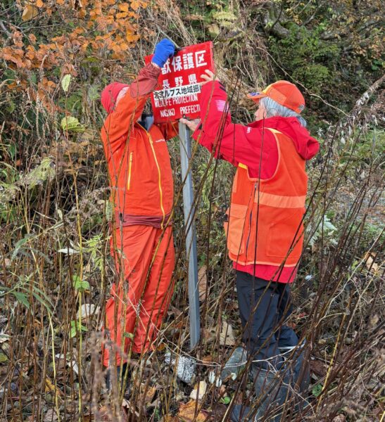 パトロールの途中、狩猟禁止区域(鳥獣保護区)の看板が外れていたので修理したり、狩猟者へ安全の注意喚起を行いました。