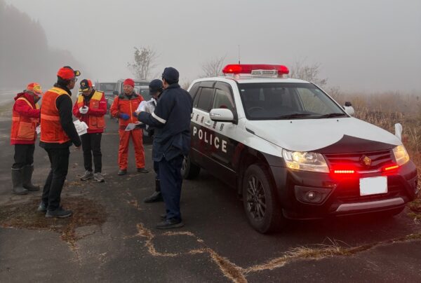 例年、狩猟が解禁される初日(11月15日)に、「狩猟者へのマナー等の指導」並びに「地域住民への狩猟解禁の周知」を図ることを目的に、北アルプス地域振興局林務課、大町警察署、大北地区猟友会、鳥獣保護監視員でパトロールを実施しています。今年も、日の出の狩猟開始時刻に合わせ、朝6時に集合して3班体制によりパトロールを行いました。