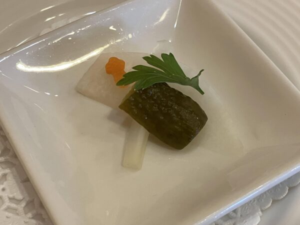 ちょっとした漬物。見てください、人参の形が🍄!!