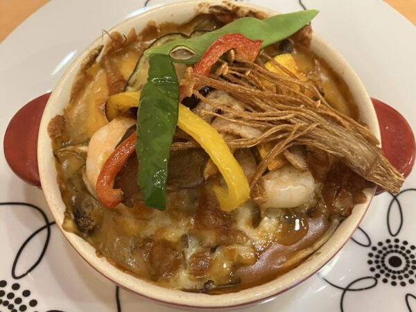 旬野菜とぷりぷり海老ドリア。海老のダシがめちゃくちゃ利いていてます。