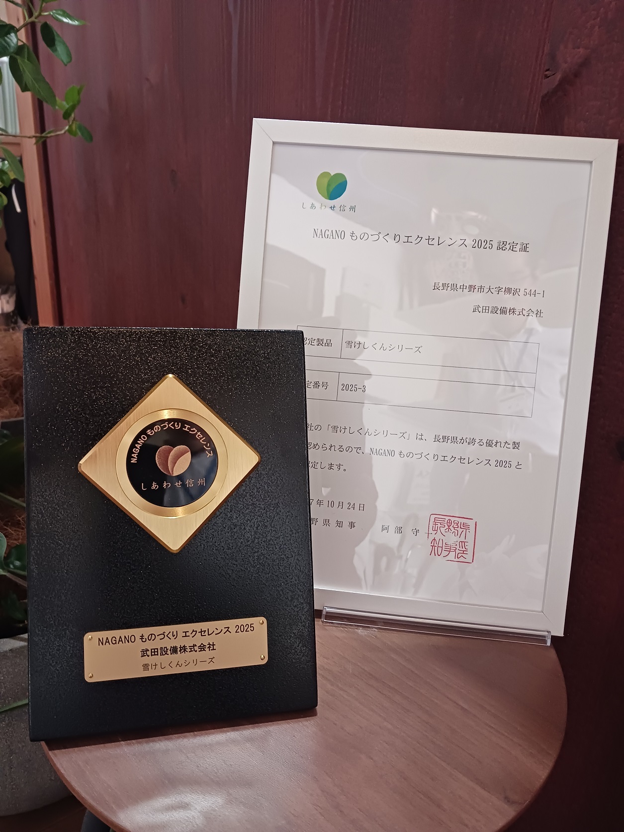 長野県は、10月24日に「NAGANOものづくりエクセレンス2025」の認定式を開催し、武田設備株式会社(中野市)の「雪けしくんシリーズ」を認定しました。