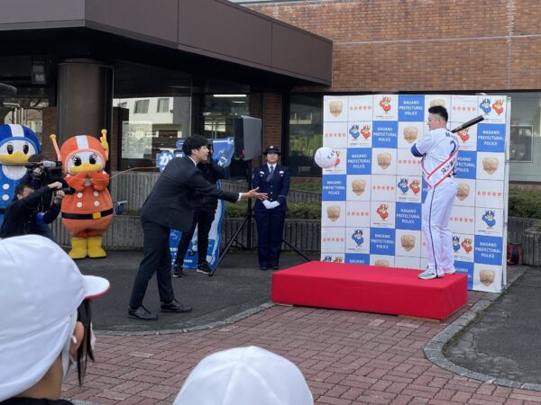 中野警察署には、交通・防犯、市町村関係者のほか、牧選手の母校中野市立中野小学校5年の児童など大勢の人が集まり、中野市出身でプロ野球・横浜DeNAベイスターズの牧秀悟選手に橋本和也中野警察署長から「安全・安心広報大使」の委嘱状・たすきが渡されました。