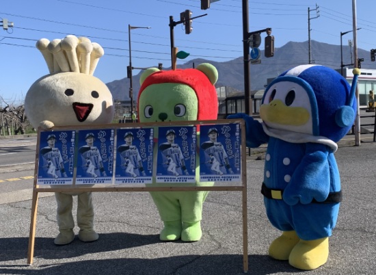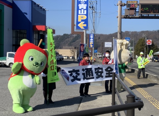 〇中野市 吉田・新井入り口交差点において、信濃グランセローズの選手や県PRキャラクター「アルクマ」、JA中野市キャラクター「えのたん」、長野県警察マスコットキャラクター「ライポくん」が参加し、街頭啓発活動が華やかに行われました。