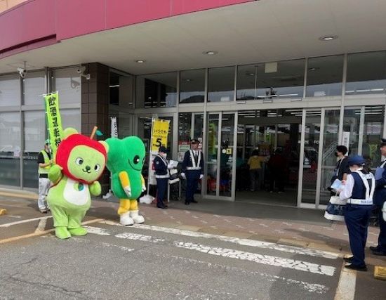 〇飯山市 ベイシア飯山店において、県PRキャラクター「アルクマ」及び野沢温泉スキー場マスコットキャラクター「ナスキー」が参加し、お客様にチラシやポケットティッシュを配りながら交通安全を呼びかけました。