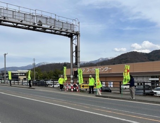 4月6日(月)、中野・飯山においてのぼり旗を持ち交通安全を呼びかける「人波作戦」とチラシ・ポケットティッシュなどの啓発物品の配布を行い、ドライバーに注意喚起を行いました。