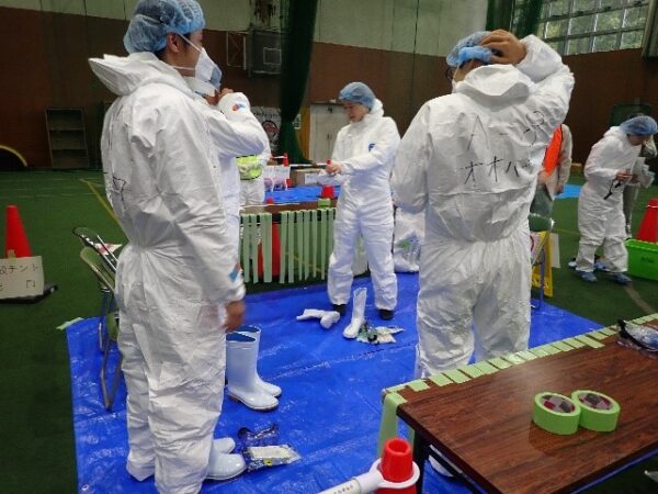 そのため隙間なく着ることの難しさや、着衣中の動きにくさ等を事前に体験し、本番時に慌てず安全に作業できるように、という目的があります。