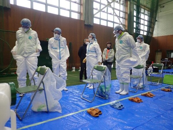 市町村やJAなどの関係機関・団体に加え、長野県建設業協会(中野支部、飯山支部)や中野警察署といった地域の皆さまにもご参加いただき、防疫作業時に着用する防護服の着脱訓練などを行いました。