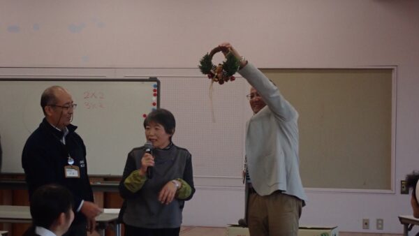 一時間ほどで完成し、班ごとに一番素敵なリースを選んで発表しあい、個性豊かなリースを楽しみました。参加者からは「パーツを巻きつけるのが難しかったが楽しかった」「最後オーナメントをつけるときにバランスを考えながらやるのが大変だったが楽しめた」という声が上がり、花とふれあう時間を楽しんでいただけた様子でした。