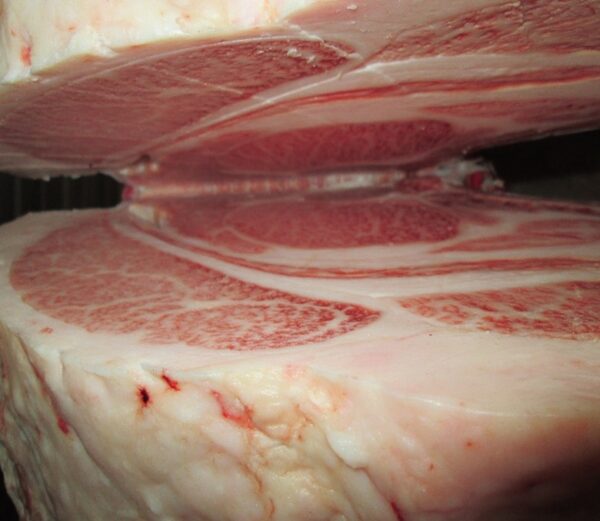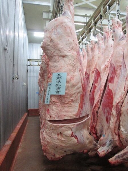 農家さんに大事に育てられた信州牛はと畜され、枝肉(いわゆるお肉と骨だけの状態)になります。