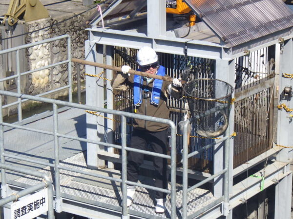 魚道の先に設置されたかごを持ち上げ、中の魚を網で引き上げます。