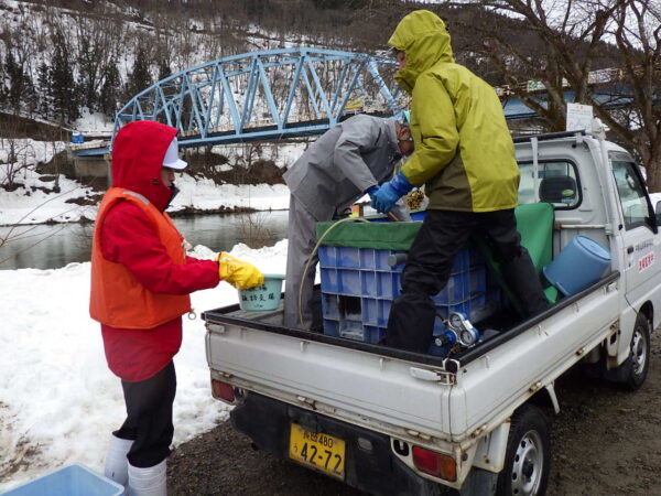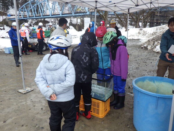 元気に帰ってきてね!そんな声をかけながら、千曲川に稚魚を送り出します。