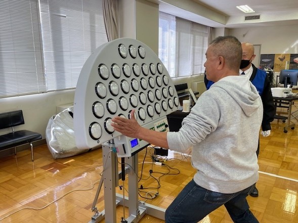 〇点灯くん・・・30数個のランプが並び「もぐらたたき」ゲームのように光ったランプを押す運転・歩行能力を診断するシステム。動作の速さと正確さで、年代に応じた「認知」「動作」「判断」「記憶」能力や、「見えにくい箇所」を診断しました。