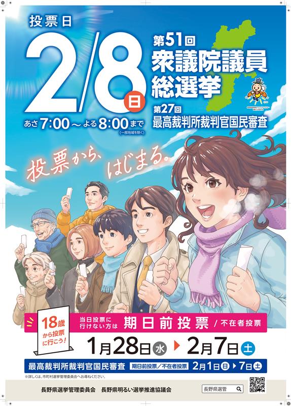 こんにちは、長野県選挙管理委員会です。 2月8日は、第51回衆議院議員総選挙及び第27回最高裁判所裁判官国民審査が行われます。 1月27日に公示されました。 1階エレベーターホールでは啓発用ティッシュを配布しています! … 続きを読む 2/8(日)は衆議院議員総選挙の投票日です