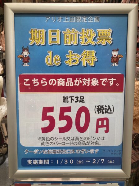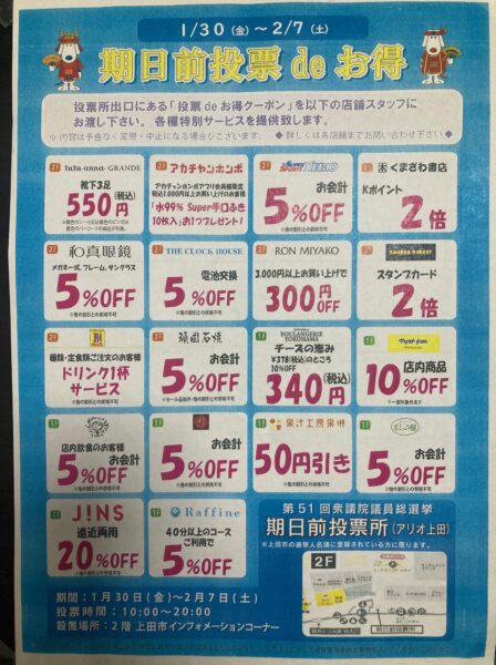 投票したかたに、『期日前投票deお得クーポン券』がプレゼントされています。