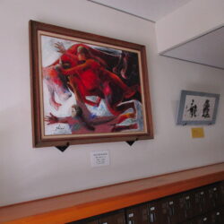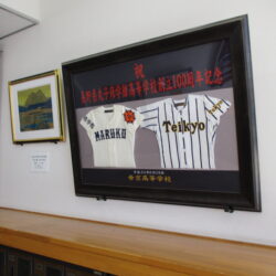 さすが、野球の強豪校の証といえるユニフォーム。立派な絵画と書。たくさんの新聞記事の切り抜き…。