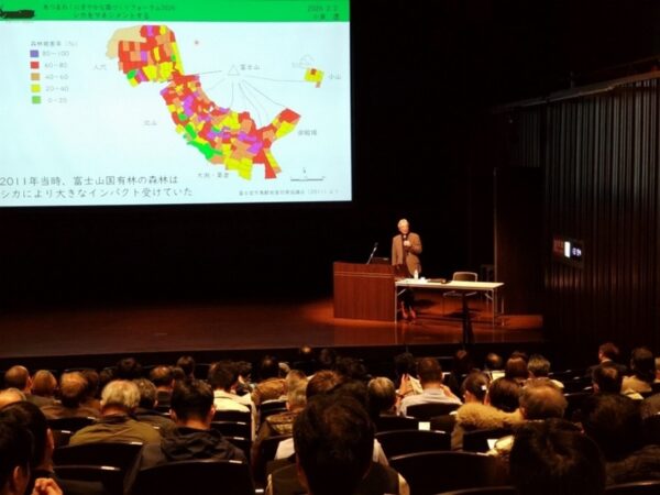 マネジメントの要素である「保護」「制御」「収穫」はシカ対策の歴史でもあること、富士山国有林におけるシカのマネジメントの実例、ジビエの活用についてお話しいただきました。