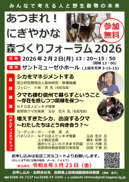 その一環として、2月2日に上田市サントミューゼ小ホールにて「にぎやかな森づくりフォーラム2026」を開催しました。