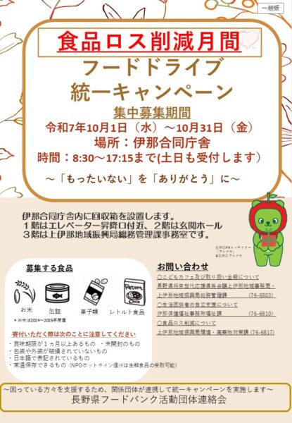 総務管理課Mです。 食品ロス削減月間の取組として、伊那合同庁舎でフードドライブを実施します。 ご家庭で使いきれない食品や眠っている食品がありましたら、是非ご ...