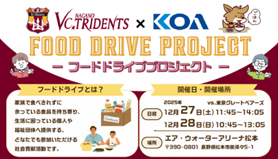 先日、VC長野トライデンツ様と、オフィシャルスポンサーであるKOA株式会社様が共同で企画された社会貢献活動「フードドライブプロジェクト」が実施され、集まった食品を長野県にご寄贈いただきました。温かいご支援、誠にありがとうございました。![]()