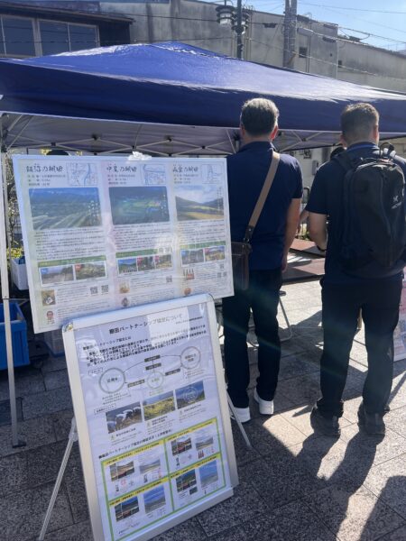左の写真は、試飲の列に並んでいる間に棚田について知っていただくために設置したパネルです。一つ目は、「つなぐ棚田遺産※」に認定された棚田の紹介です。二つ目は、「棚田パートナーシップ」についての説明です。