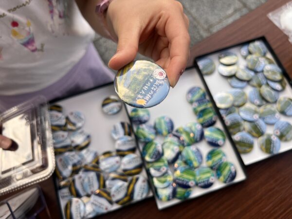 また、お酒の試飲と併せて、農地整備課オリジナルの「棚田缶バッジ」の配布も行いました