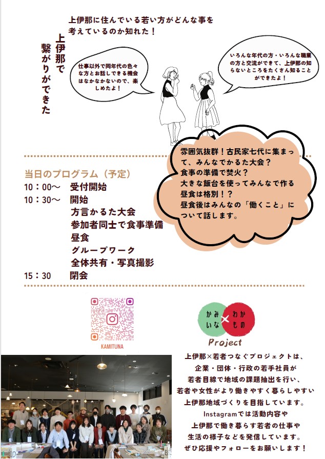 (上伊那で働いている・暮らしている方、上伊那の出身の方 など) ♦参加費 :1800円(会場費+昼食代)