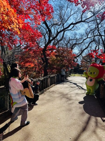 アルクマが紅葉を背景にポーズを決めるシーンは、スタッフ全員が