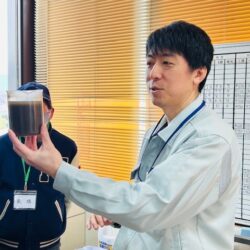バキューム車で集められたし尿からトイレットペーパーのカス等ごみ類を取り除いた後、「バチルス菌」が循環し優先化 ※2 された処理水槽でし尿の成分を分解していきます。「バチルス菌」は自然界のどこにでもいる菌で、納豆や味噌、漬物等食べ物にもいるそうです。「バチルス菌」の活躍で、臭くない汚泥(実際に嗅いでみましたがにおいません!!!)ができ、それを更に処理することで飲めるほどの水と臭くない肥料(これも嗅ぎましたがにおいません)になります。 ※2 特定の菌が活発に活動できる状況。