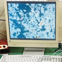 ※バチルス菌が元気よく活動するために空気が必要。毎朝 汚泥を顕微鏡で観察し、そこにいる原生動物の種類によりバチルス菌が活躍できるちょうどよい空気量を確認する。画面は、顕微鏡で観察した原生動物「エピスティリス」(和名ツリガネムシ)。