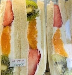 本日買った完熟の生のフルーツがたっぷり入ったフルーツサンド。断面がキレイで食べ応えも充分!、くだものの甘さを邪魔しない生クリームとの相性も抜群です。