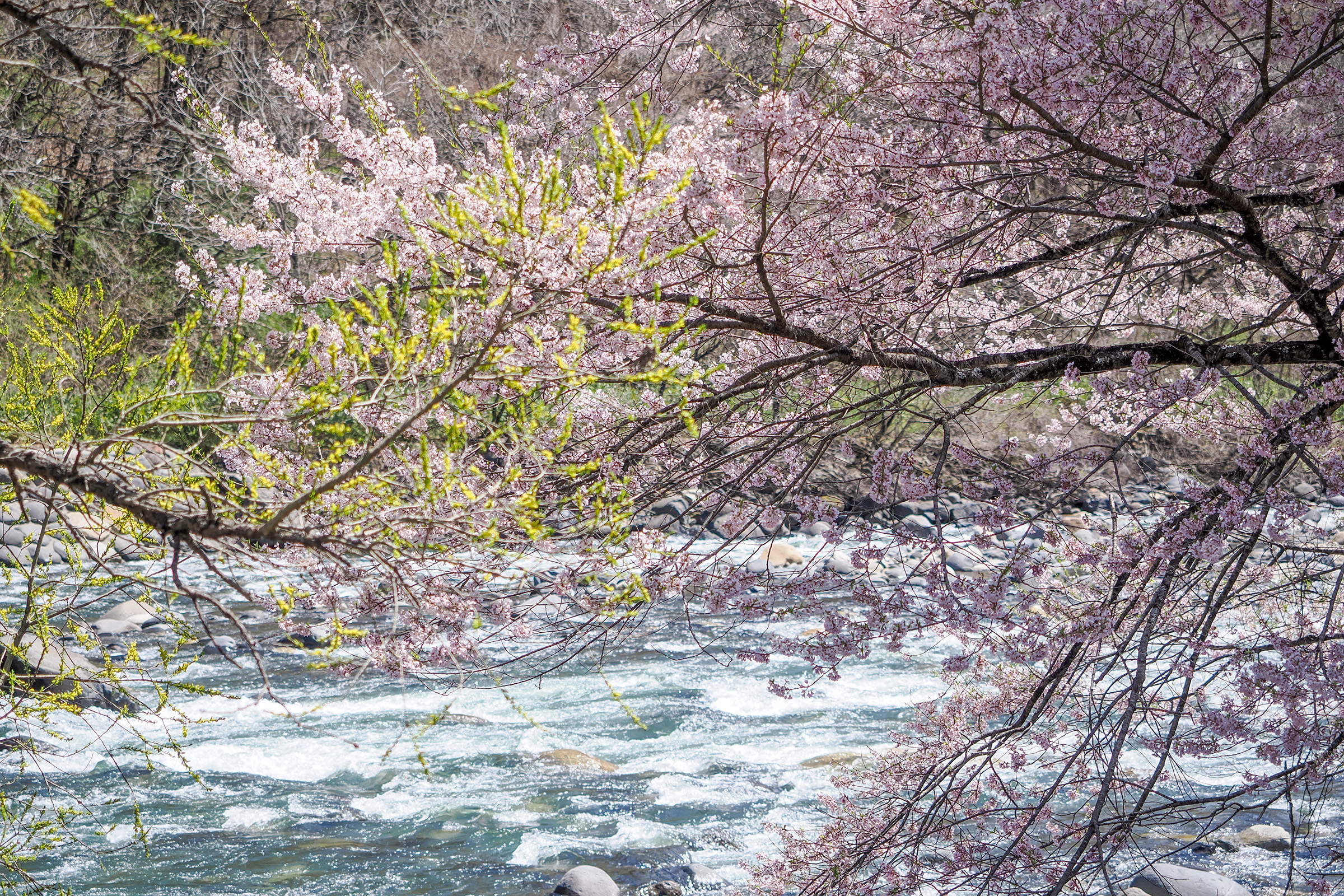 三岳地区へ足を伸ばすと県道20号沿いに桜が立ち並ぶ場所がいくつもあり、春のドライブの気分を盛り上げてくれます。