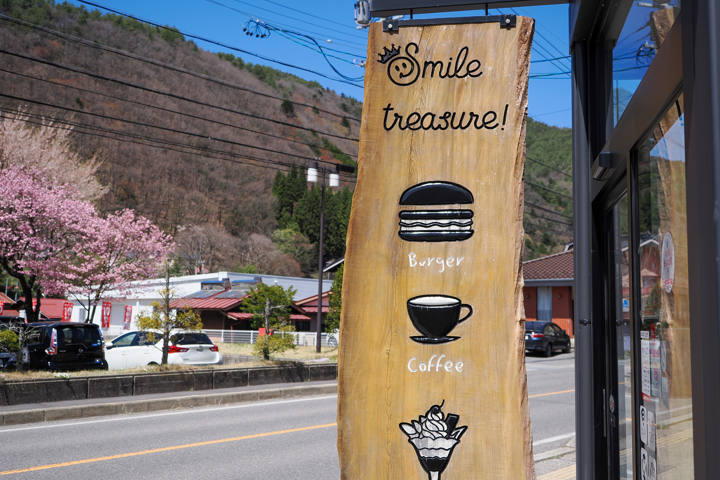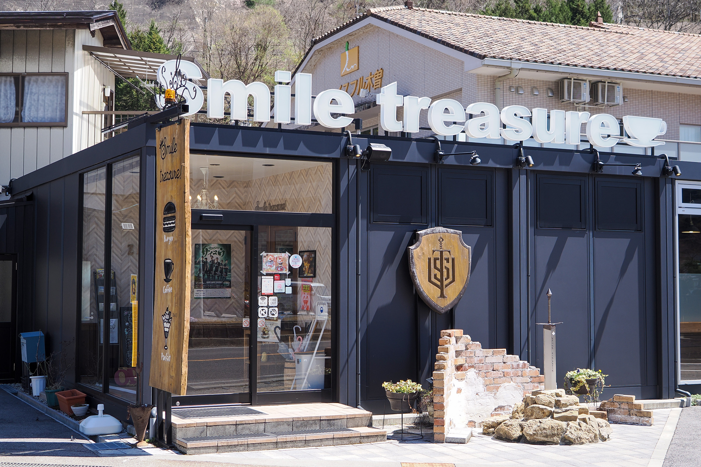 木曽合同庁舎から道路を渡ってすぐ目の前にあるのは、ちょっとした雑貨のお買い物も楽しめるカフェ「Smile Treasure」です。