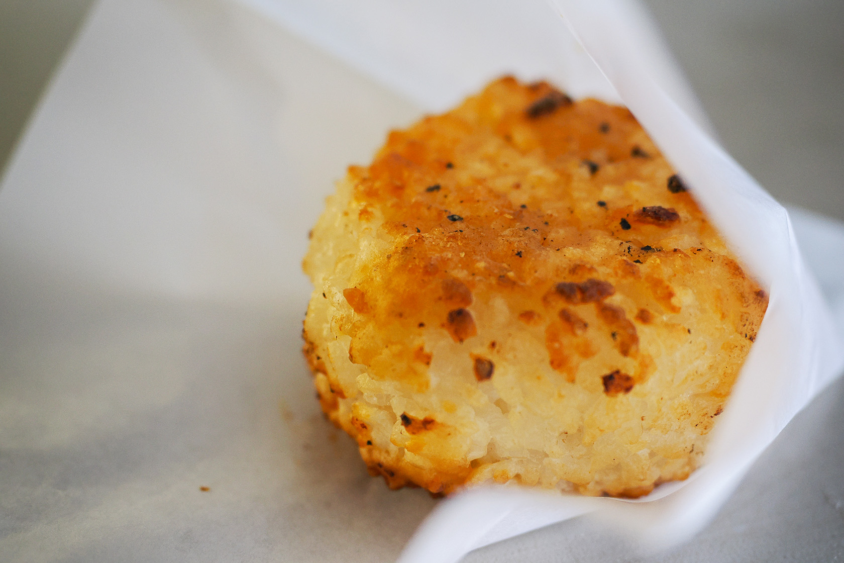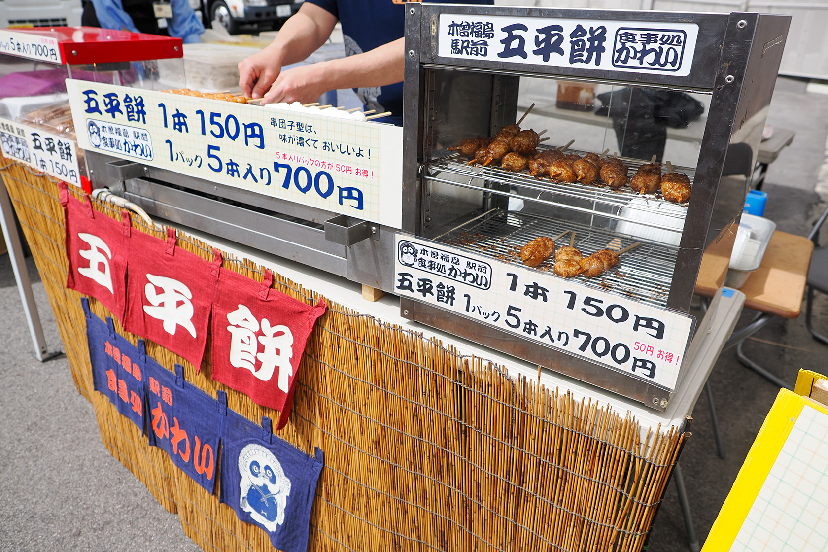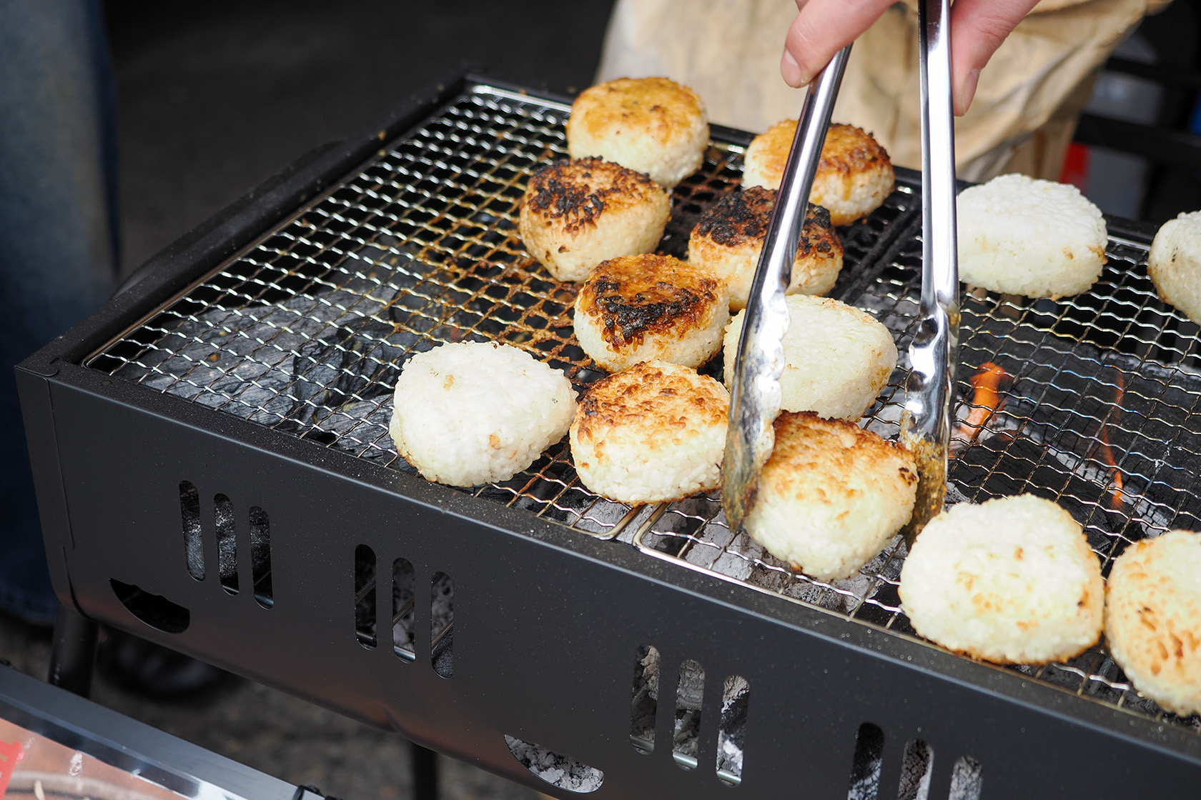 「茶房 松島」がコラボレーションした味噌焼きおにぎりは、お客さんの目の前で炭火で炙るパフォーマンスつきです。味噌の焼ける香ばしいにおいが、道行く人の食欲をそそります。あたたかい味噌汁もあり、一服できました♪