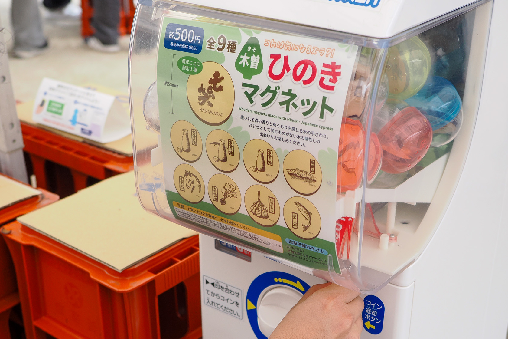 会場内に設置された木曽町商工会のガチャガチャでは、ひのきのマグネットが販売されていました! カプセルをあけると森の香りが広がり、木曽地域に来た実感がわいてきます。