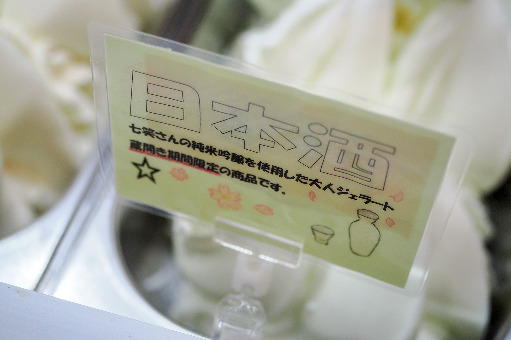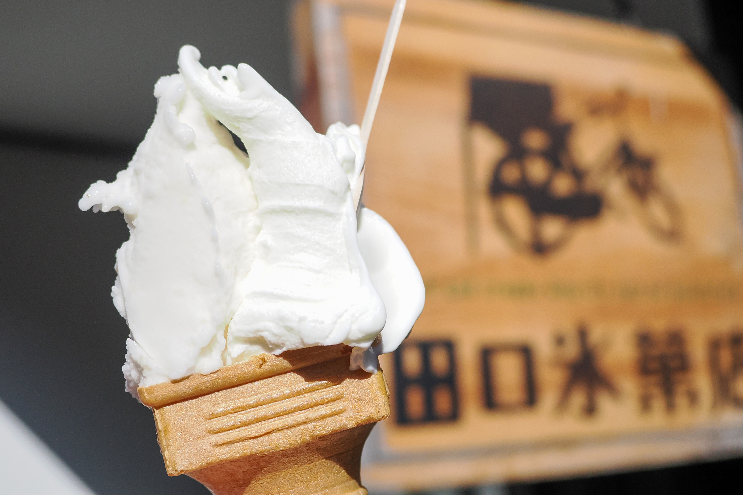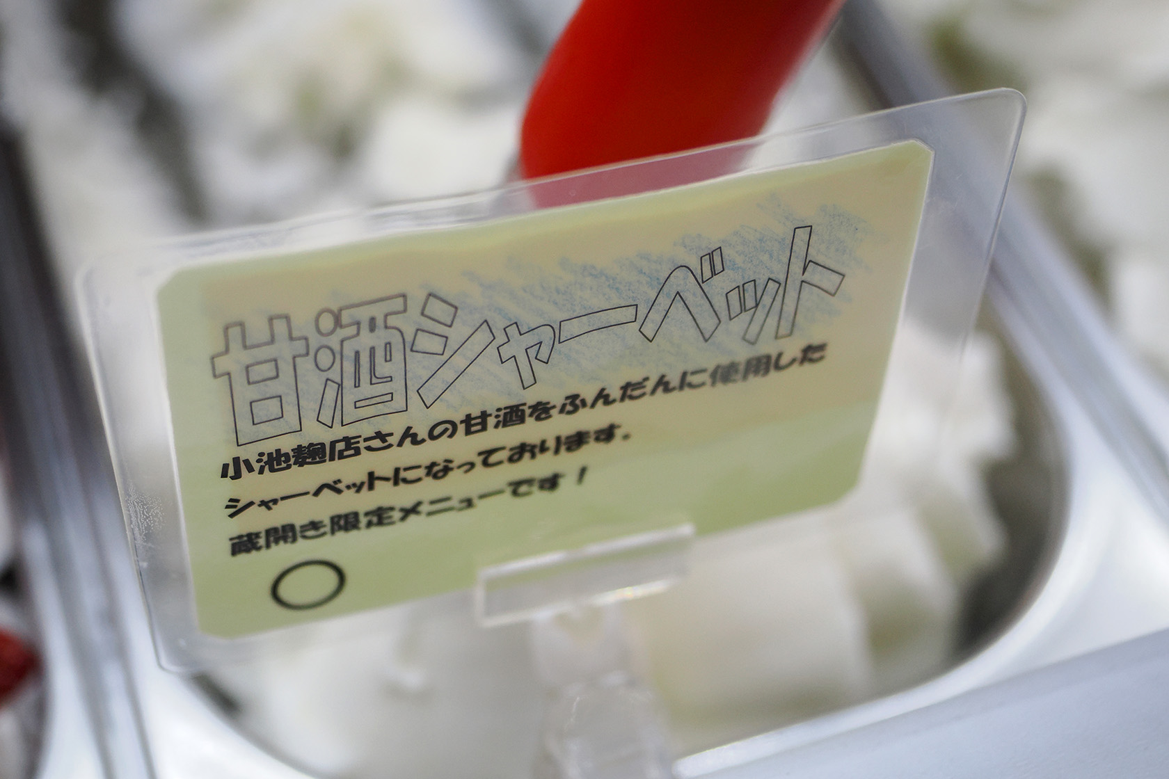 道すがら田口氷菓店に立ち寄り、どれもおいしそうで目移りする中、迷った末にイベント限定の甘酒シャーベットと日本酒ジェラートを購入しました。どちらも白色ですが、味わいも食感もまったく異なります! 美味です。