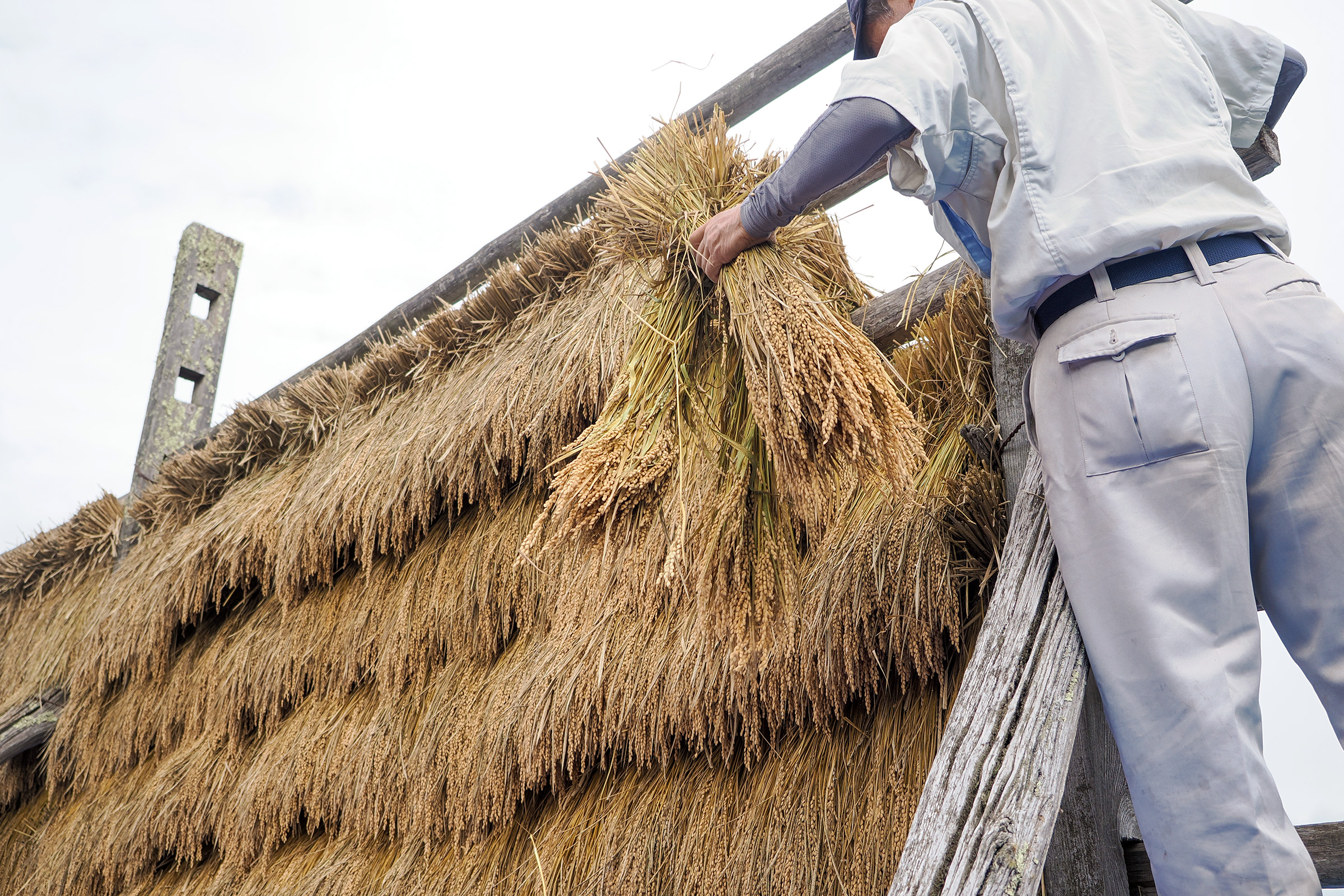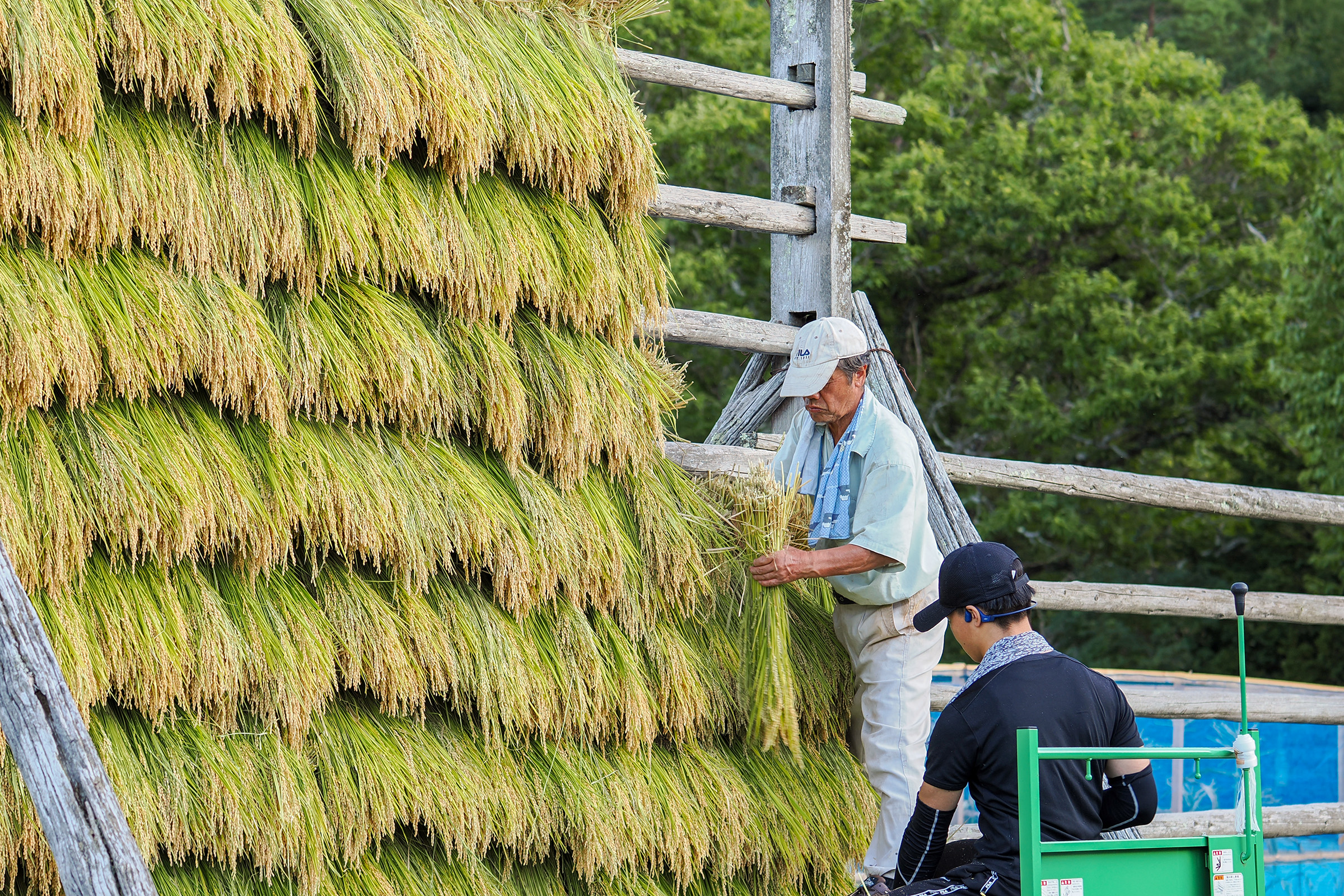 はざかけから約3週間後、天日で干した稲をはざ(稲架)からはずして脱穀します。