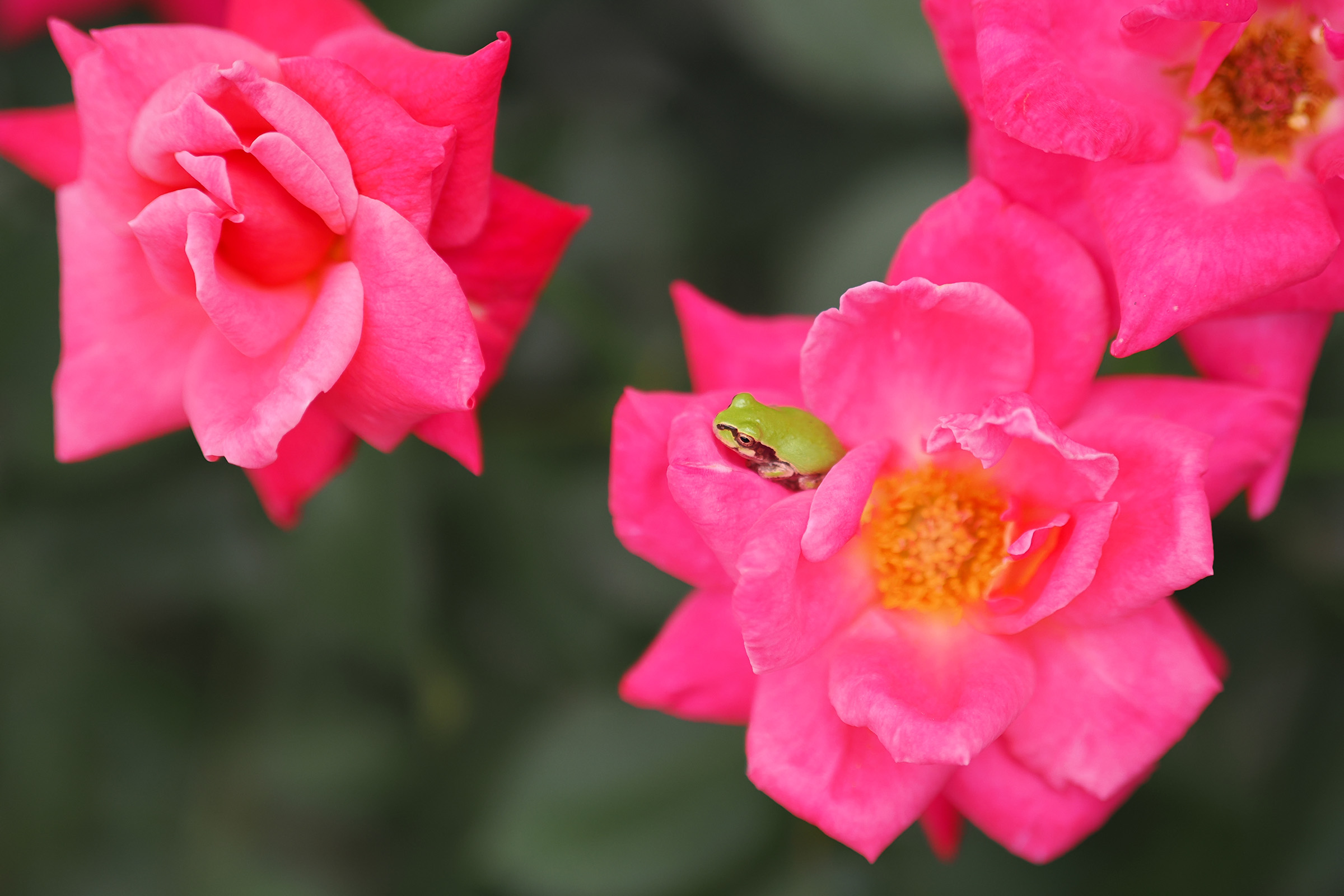 ふと花壇に目を向けると、稲刈りの騒がしさから逃れたアマガエルが花の中で昼寝をしていました。