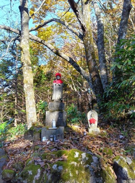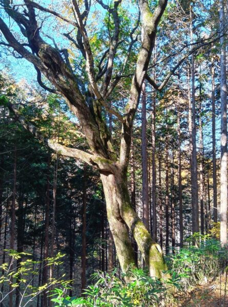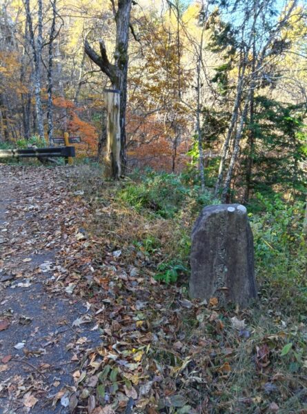 地蔵峠です。これより開田高原という石碑があります。歩道(旧飛騨街道)を少し下ると縁結びの木がありました。二種類の木が一本になっていて、悲恋の言い伝えがあります。