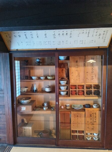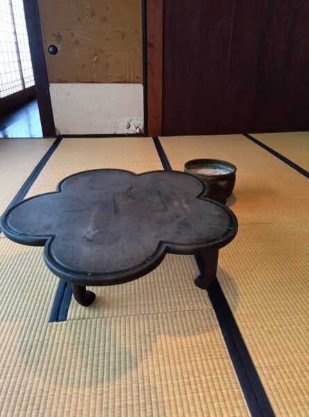 建物内には当時の生活道具や馬に関する資料が展示されています。かわいい猫足の座卓がありました。松竹梅のデザインになっています。