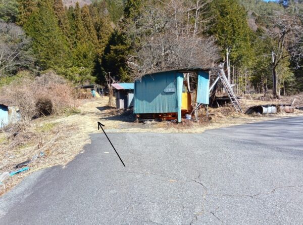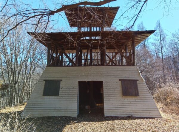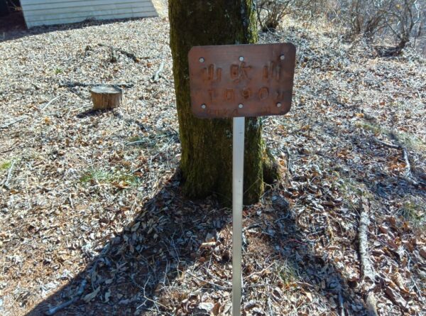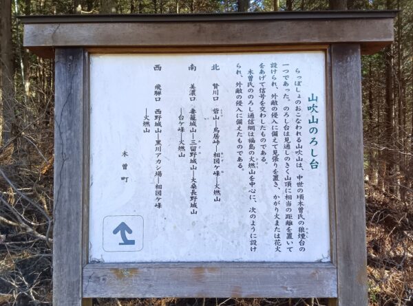 登山口です。青い小屋の左側を行きます。 看板がありました。狼煙台だったそうです。