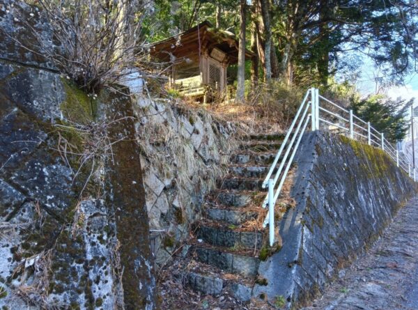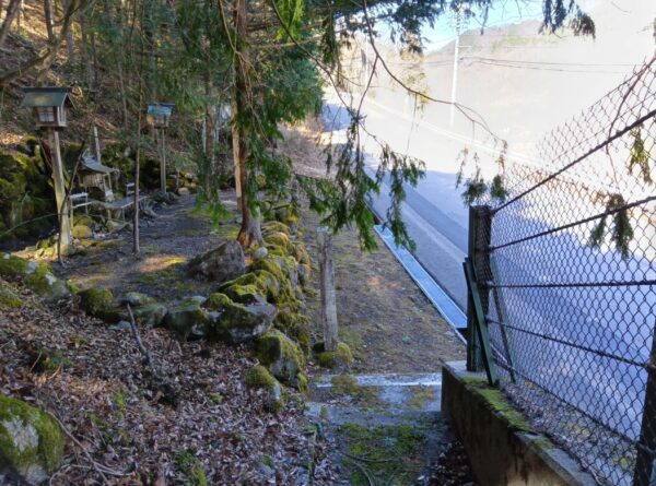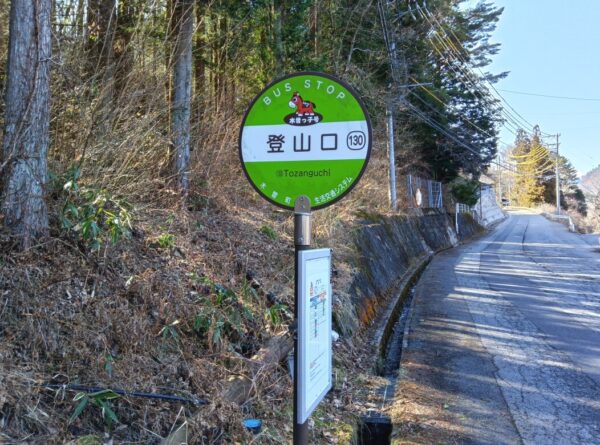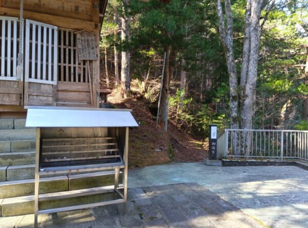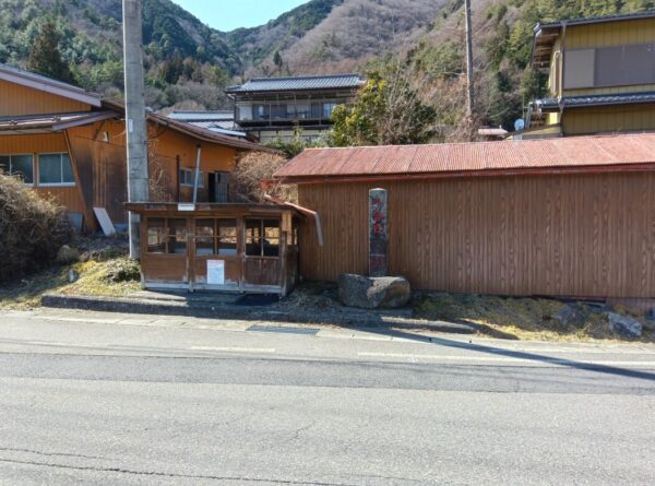登山口というバス停がありました。近隣の方に聞いたところ、この辺が御嶽山の登山口で、この道(県道)が登山道だそうです。バス停の近くに、黒沢口を開いた覚明行者の納骨堂がありました。