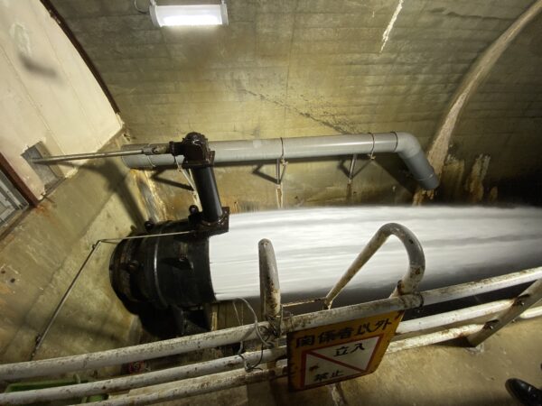 監査路を進んでいくと、発電用の放流トンネルがあり、職員の方がバルブを操作し、放流を見ることができました。