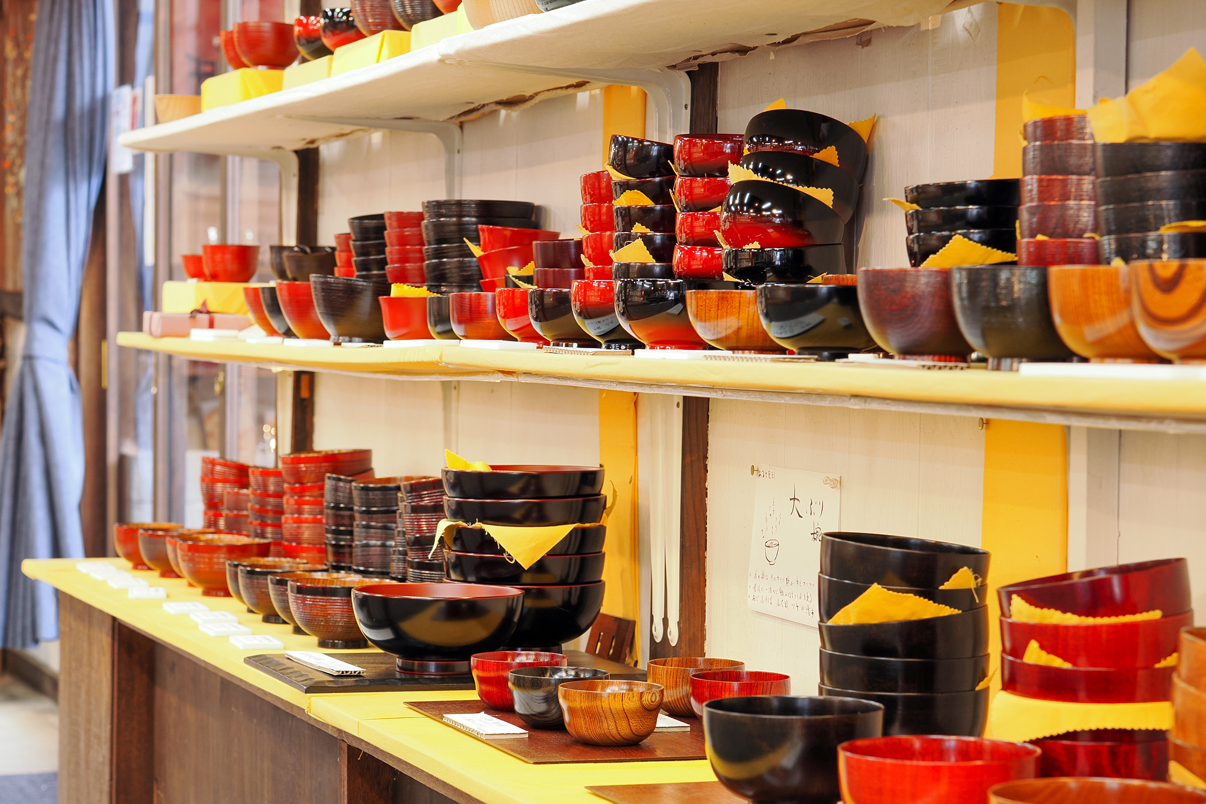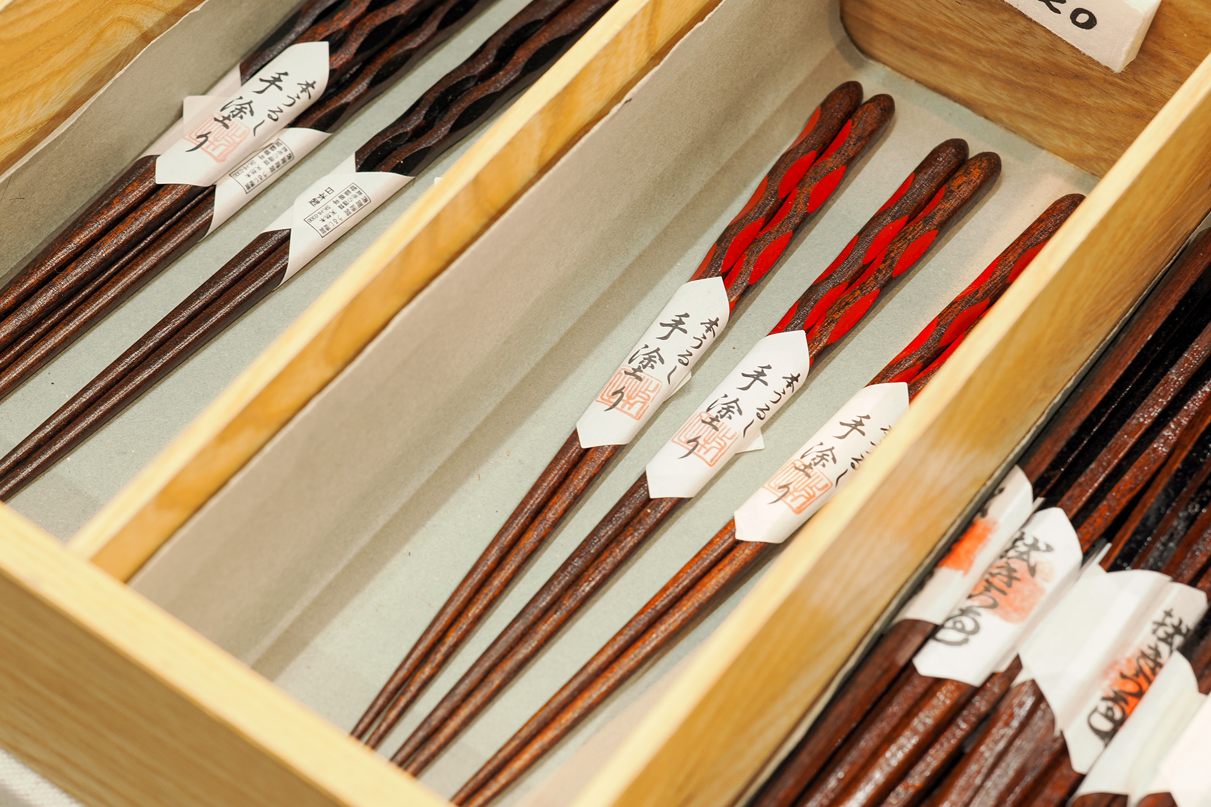 木曽福島の商店街には漆器屋さんが2軒あり、この日は「海老屋漆器店」で海外に住む友人へのギフトを探しました。