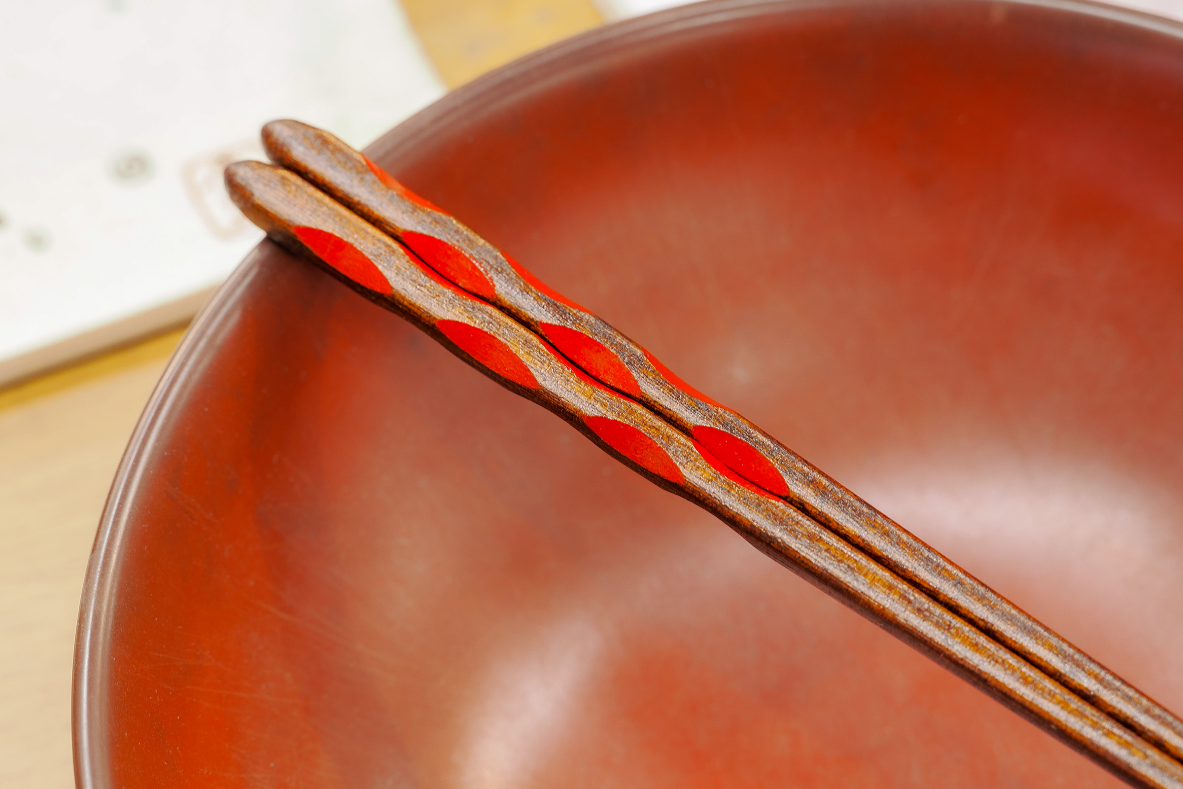 へこんでいる部分同士をあわると大きな赤い水玉模様が現れる、オシャレなデザインの箸を選んでみました♪