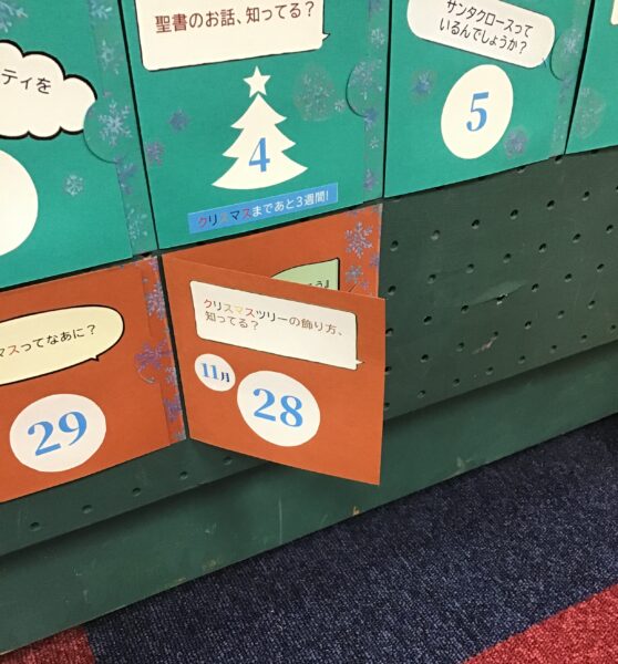 児童図書室にあるアドベントカレンダーは日にちの書かれた扉をめくると、中にクリスマスに読みたくなる本を紹介しています。